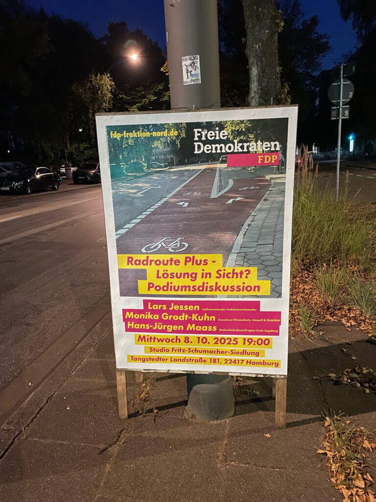 Hamburg-Nord, 28. 9. 2025: Die FDP-Fraktion in der Bezirksversammlung Hamburg-Nord kündigt eine moderierte Podiumsdiskussion mit dem bekennenden Extrem-Radler und stellv. Fraktionsvorsitzenden Lars Jensen und dem ehrenamtlichen Radverkehrsbeauftragten des Kreises Segeberg an.